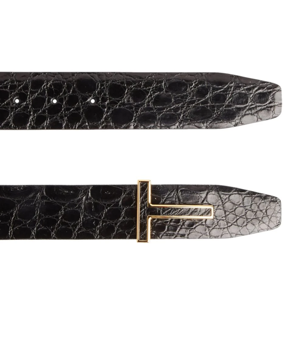 Perfectly exemplifying the label’s love of opulent accessories, this TOM FORD belt will lend an exotic touch to your formal ensembles. Crafted in Italy from natural crocodile skin for an unmistakable, textured look, it spotlights the iconic T logo in the form of a gleaming gold-tone buckle for a polished presentation.