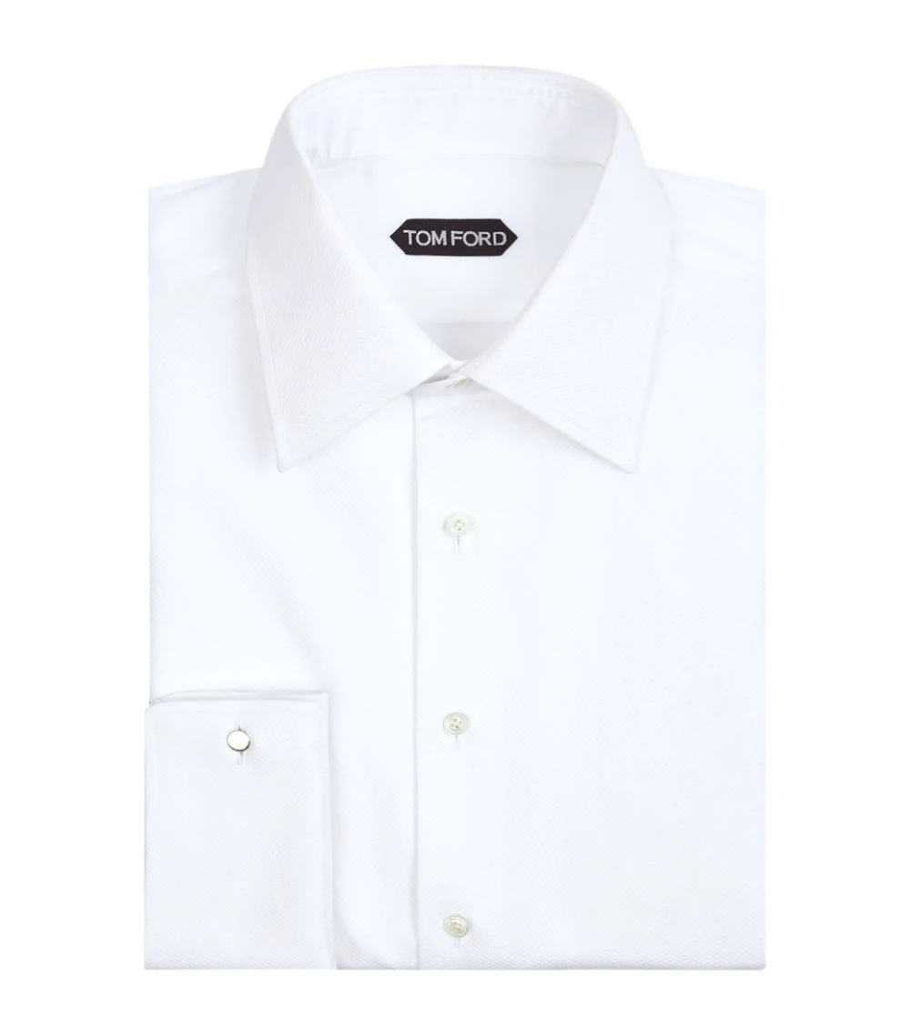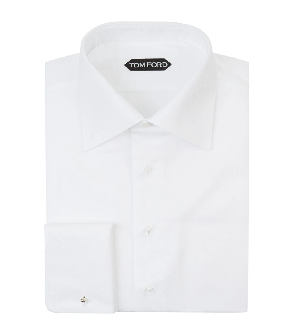 Give your smart staples a debonaire finish courtesy of the TOM FORD cocktail shirt. Luxuriously crafted with the finest cotton, it boasts a soft poplin design in crisp white and is complemented with a textured piqué bib, sharp point collar and double fastened cuffs. Perfect for any special evening occasion paired with sharply tailored trousers and polished shoes.