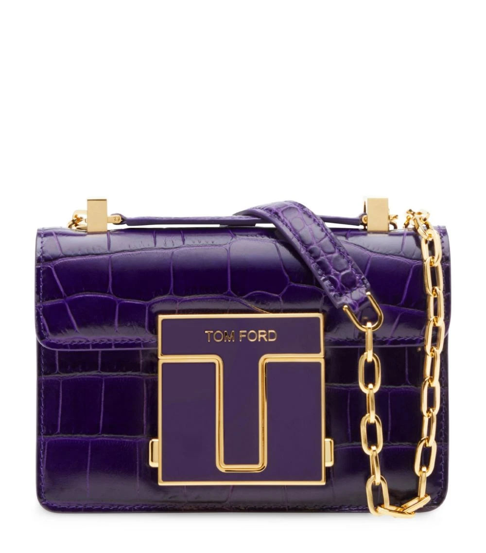 This small TOM FORD 001 bag is characterised by its unique fastening – a sleek detail in which a gold-tone T motif secures the flap shut. When closed, it presents a solid plate of luxurious metal that stands in exquisite contrast to the croc-embossed leather construction, rendering it a statement addition to street-style edits.